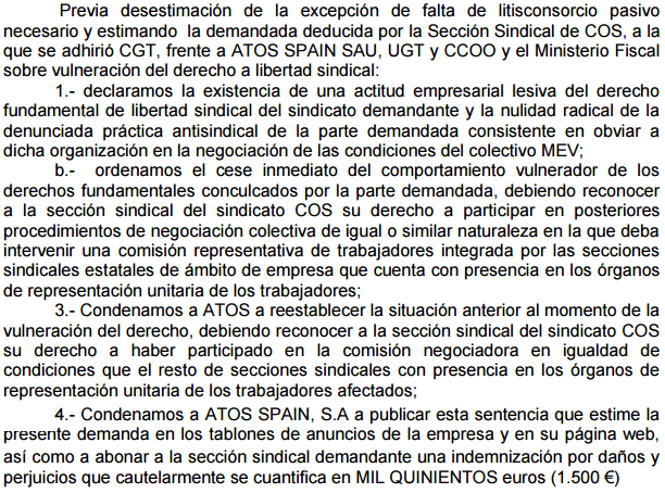 Ya hay sentencia, con fecha de 27 de marzo, del Juicio celebrado el 22 de marzo en la Audiencia Nacional por la denuncia de Tutela de Derechos Fundamentales que presentó COS. Éste es el fallo del tribunal:
