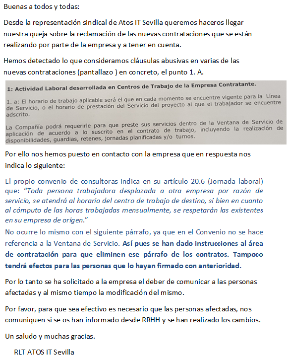 Queremos hacer extensible este comunicado, que ponemos a continuación, a todos los trabajadores de Atos IT por si esta cláusula se estuviese introduciendo en todos los contratos, ya que queremos recordar que la adaptación del horario a una ventana de servicio solo es válida para los trabajadores que están bajo el convenio de Atos IT Madrid, ya que la ventana de servicio fue uno de los muchos regalos que hizo CCOO a la empresa en este mierdiconvenio, para el resto de trabajadores de Atos IT esta cláusula es ilegal y no tiene aplicación ninguna la ventana de servicio.