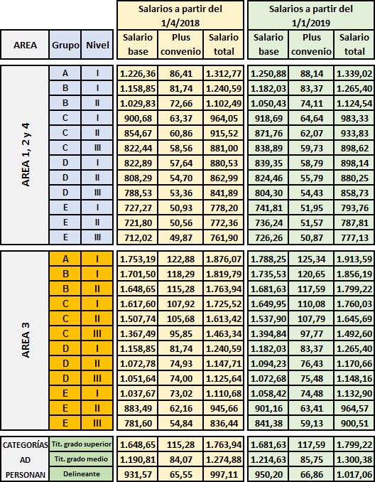 A la espera de lo que nos cuente RRHH el próximo 29 de enero en la reunión de la Mesa de Diálogo Social sobre la aplicación del nuevo Salario Mínimo Interprofesional, hemos preparado unas Tablas Salariales para 2018-2019 con los importes mensuales correspondientes (recuerda que tenemos doce mensualidades naturales, más una paga extraordinaria en el mes de julio y otra en Navidad).