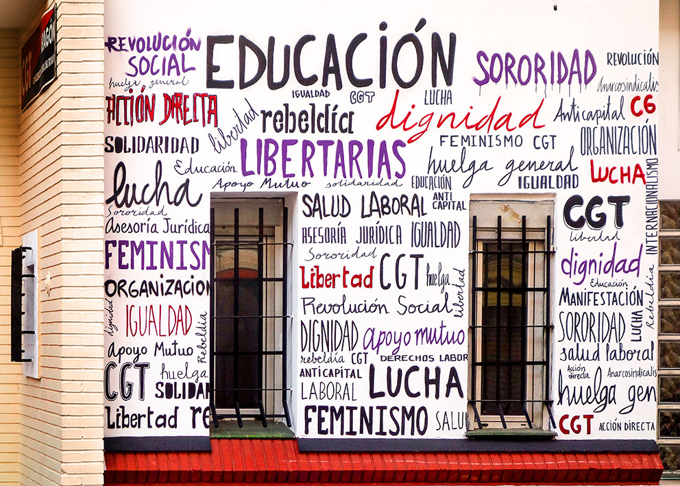 Que un sindicato ponga en su fachada a lo que aspiran, a quien defienden, qué son, es de aplaudir por su osadía en tiempos de tantas mentiras y tantos disfraces. Osadía por la claridad y por algunas de las palabras puestas, que seguro producirán escozor. Palabras peligrosísimas pues ayudan a los más débiles a concoer las herramientas de que disponemos para intentar levantar la cabeza.